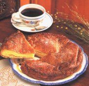 KOUIGN-AMANN, signifie "Tourte beurrée" ; c'est une tourte en effet, une pure merveille avec sa pâte feuilletée en minces lamelles et en onctueuses couches de beurre et de sucre. Ce petit chef d'oeuvre de la gastronomie bretonne a une origine lointaine et contestée. Pour certains, cette tourte dérivé du pain sucré des Norvégiens qui venaient là au 17è siècle, pour d'autres d'une vieille recette à peu près similaire du Finistère ; pour d'autres enfin, cette tourte viendrait d'un immigré sicilien nommé Scordia dont les ancêtres, menuisiers, étaient venus s'installer dans le pays au Moyen Âge. Bref, qu'importe l'origine de ce chef d'oeuvre Breton, c'est délicieux, en particulier tiède.