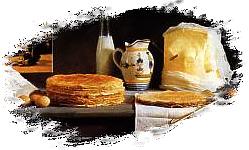 Crêpes et galettes servies avec une bolée de cidre ou une écuelle de gros lait constituaient jadis le repas traditionnel du vendredi. Aujourd'hui les maîtres-crêpiers préparent pour le régal de nos palets les grands classiques, à l'ouf, les complètes, les spécialités accommodées des produits locaux, " la pensardine ", la campagnarde, la concarnoise et les crêpes sucrées à base de froment qui furent longtemps un luxe tant les terres pauvres de Bretagne ne convenaient pas à cette céréale. Galette de sarrasin, crêpe de froment, c'est la Bretagne authentique qui festoie dans les murmures des chansons d'autrefois. " Fleur de Blé Noir ", la chanson du meunier, la berceuse de la crêperie.